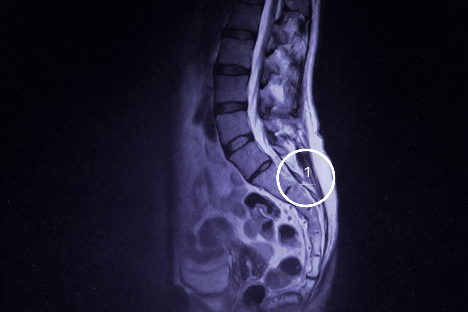Bij markering ① is de lumbosacrale overgang zichtbaar: het gebied waar de onderste mobiele lendenwervel overgaat in het sacrum.