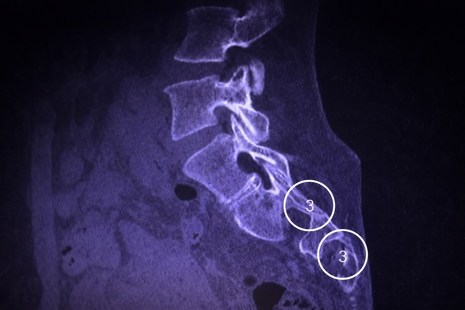 Bij markeringen ③ is in profiel te zien hoe de vergrote dwarsuitlopers van de onderste lendenwervel zich verhouden tot het sacrum.