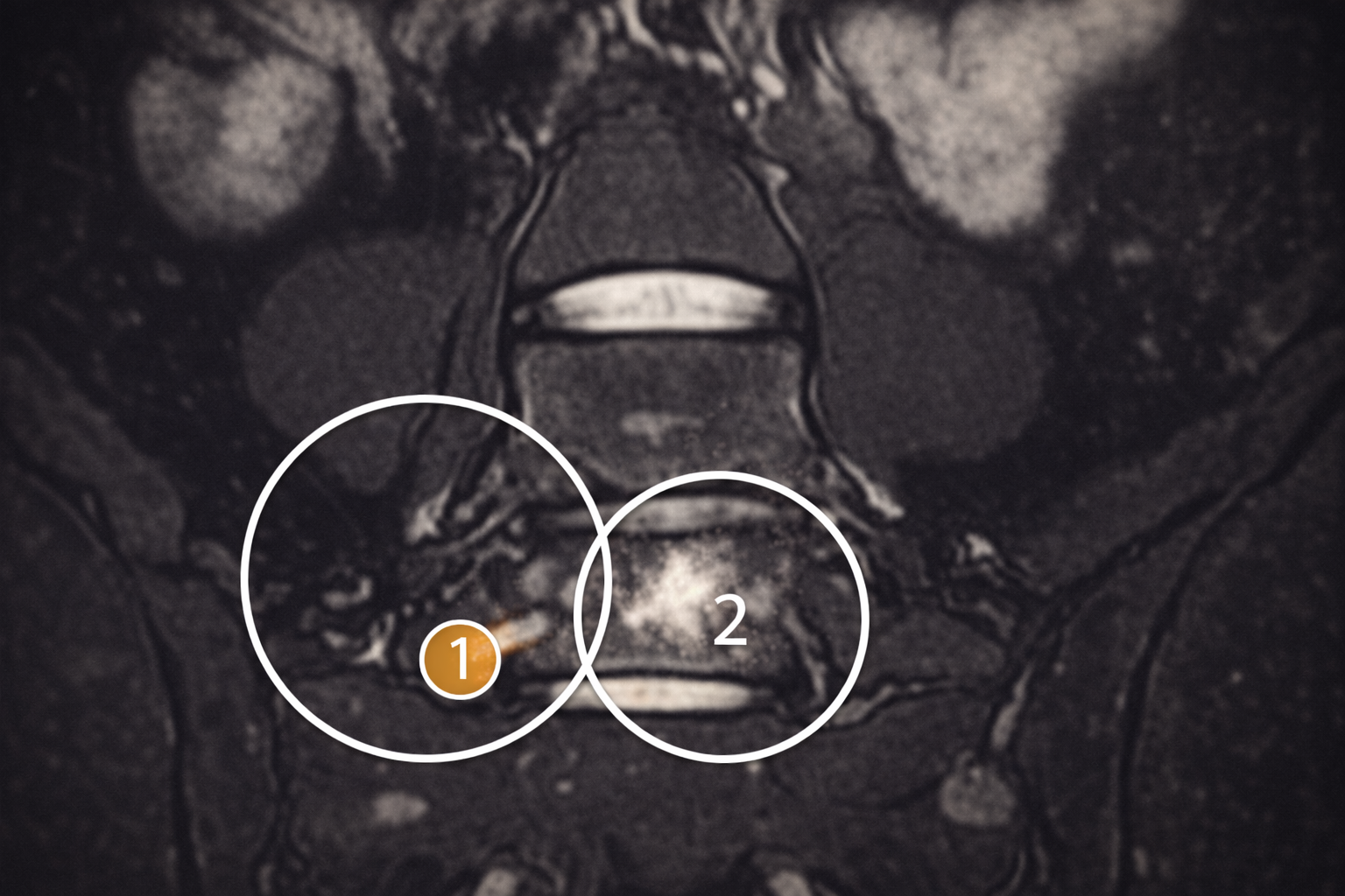 Bij markering ① is de linker lumbosacrale overgang zichtbaar. Hier is te zien dat de transversale uitloper van de onderste lendenwervel (L5) verbreed is en contact maakt met het sacrum. Dit wijst op een lumbosacrale overgangswervel met een pseudo-articulatie.