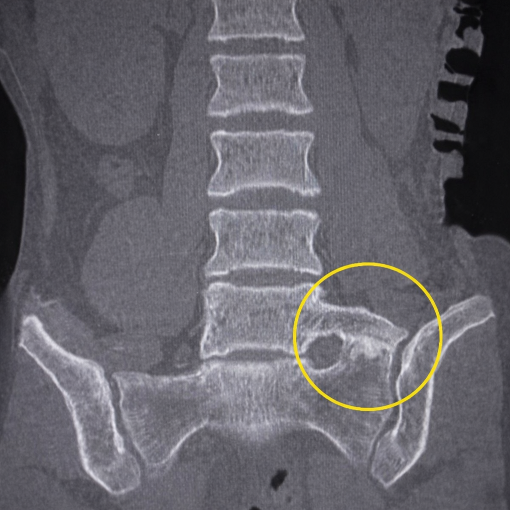 CT-beeldvorming is bijzonder geschikt om botstructuren en accessoire articulaties duidelijk te visualiseren. Hierdoor kan de anatomische relatie tussen de lumbale wervel en het sacrum nauwkeurig worden beoordeeld.